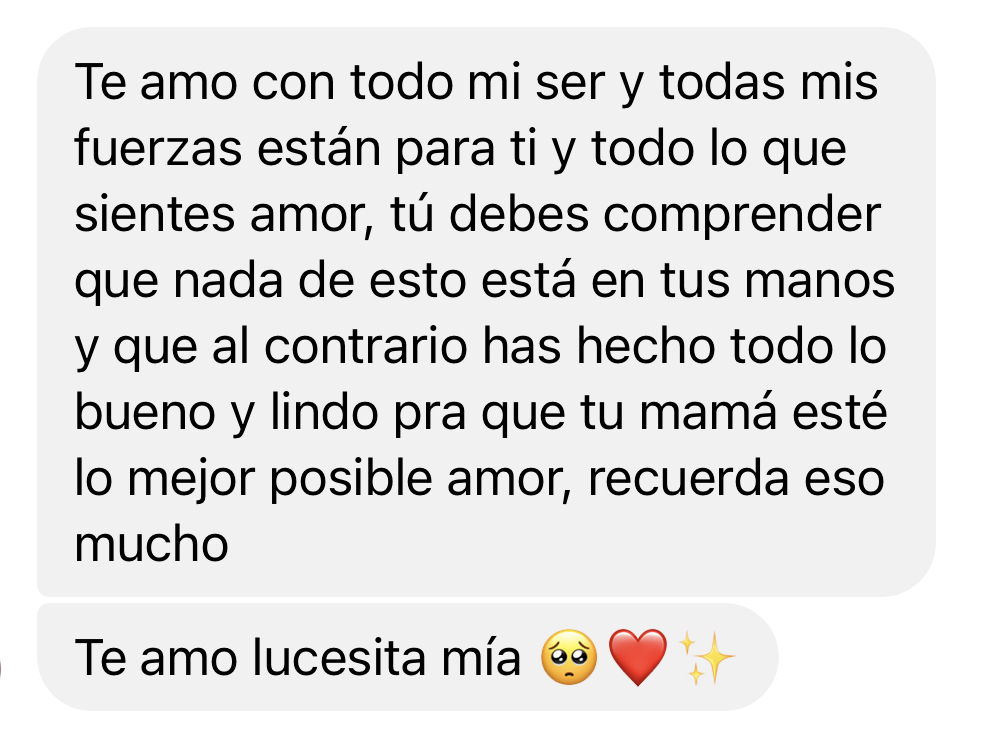 Acabo de ver tus manitos, me dio mucha tristeza. El no poder cuidarte y ayudarte a sanar me mata de la penita. Te amo con todo mi corazon.
