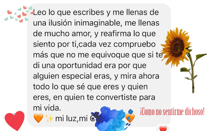 Pero cuando me imagino cosas como estas contigo, vuelvo a sentir felicidad y esperanza.