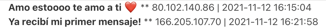 Hola mi amorcito, pues ya volviste a tu Colombia querida, complicada, bella, pero amada. Yo te envidio, por que yo no tengo mi patria. Solo quería decirte que te amo muchísimo, mas y mas de lo que te imaginas. Amo todo el tiempo que me diste cuando estabas allá, amo cada mensaje que me mandaste, fotos, amo que compartiste esa cena de sushi conmigo, tus viajes y hasta tú situación con él. Nunca creo que encontraras a alguien en tu vida como yo, tan abierto a escucharte, a aconsejarte y a amarte de una buena manera. Quisiera estar contigo a toda hora y a todo minuto, no dejarte salir de mi vista. Me encantas mi amor, muchísimo.